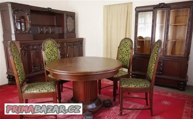nabídka se skládá z 10 kusů a to sekretáře s komodou, příborníku s komodou, kulatého rozkládacího stolu, 4 židlí a závěsných hodin.