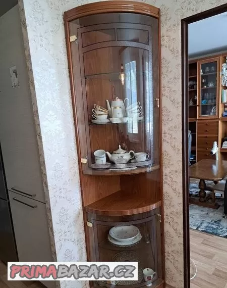 Prodám rohovou prosklenou vitrínu, barva ořech, 45 cm strana, výška 212 cm.