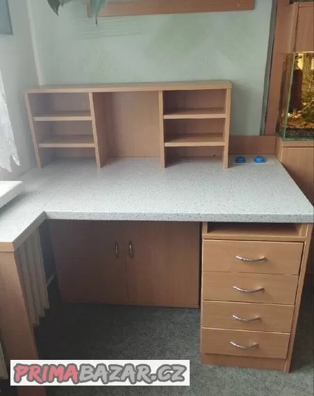 Velký psací stůl s úložným prostorem+ nástavba+ 4 šuplíky+ skříňka pod stůl. Do stolu jsou i zavedené dvě zásuvky do které se může dát lampička nebo zapojit tiskárna. Může být využit jako rohový stůl a poslední roh drží skříňka, kdyby byl zájem může se udělat i poslední noha a záda stolu kdyby nebyl využít jako rohový.