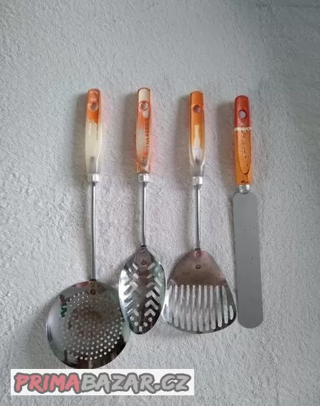 Sada nádobí od babi cca 50 let+ - 4ks chrom, plast 150 Kč.
