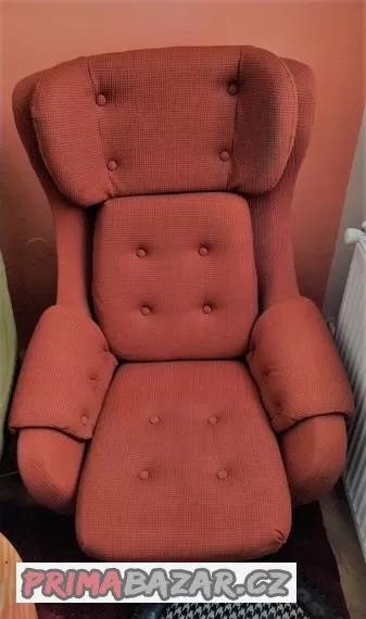 Prodávám legendární retro křeslo ušák (výroba ČSSR 80. léta UP závody Rousínov) skořepinová konstrukce, molitanové područky podhlavník, zádová a sedací matrace, čalouněno dobovou látkou barva cihlová červeň, kovová otočná pětiprstá noha. Křesla jsou ponechána v původním zachovalém stavu, čalounění je nepoškozené, kovová noha bez prasklin, otočný mechanizmus funkční.