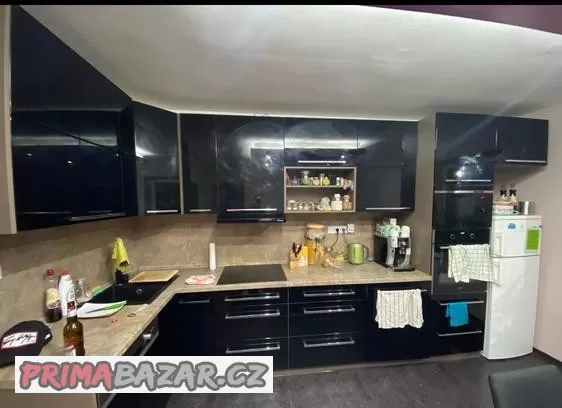 Prodam rohovou kuchyni černý lesk později horní skříňky polepeny zelenou fólii