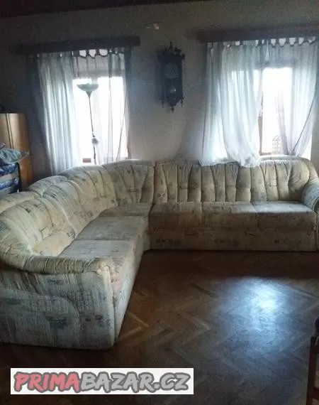 Prodám rohovou rozkládací sedací soupravu vyrovenou na zakázku včetně taburetu s úložným prostorem. Rozměry: dvojsedák 138x54cm, trojsedák 160x54cm, výška sedu 43cm, celková výška 90cm, rozložené lůžko 136x68cm, taburet 70x53x43cm. Nepoškozená, velmi dobrý stav.