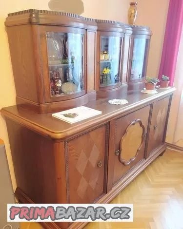 je po babičce, rozměry dolní díl:š-200, v-103, hl-75, 3x dveře, uvnitř 1 police, horní díl volně stojící na spodním: š-170, v-68,5, hl-42, 3x prosklené dveře, 1 police. Dolní díl lze důmyslně demontovat pro stěhování, svislé díly mají čepy. Odběr v Praze 3 s vlastním odvozem. Nabídky mailem nebo sms