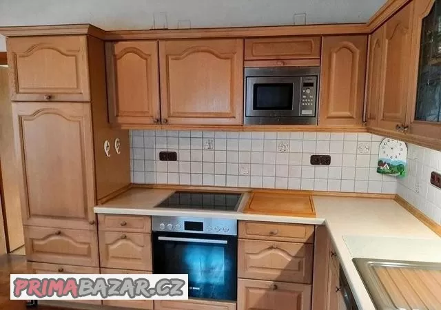 Rustikální kuchyně, 275 x 220 cm. Spotřebiče: trouba + varná deska, digestoř, vestavěná mikrovlnná trouba, myčka, vestavěná lednice.