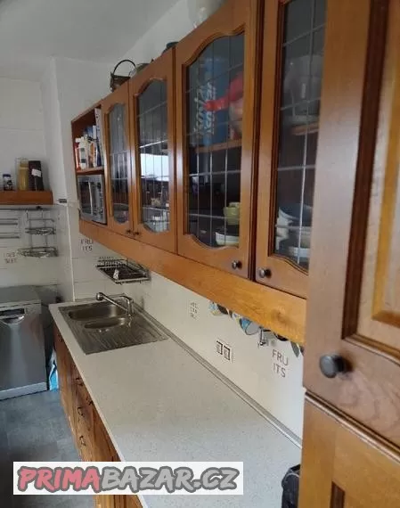 Použitá kuchyňská linka. Dvířka jsou z dubového masivu koňak. Mosazné kování.