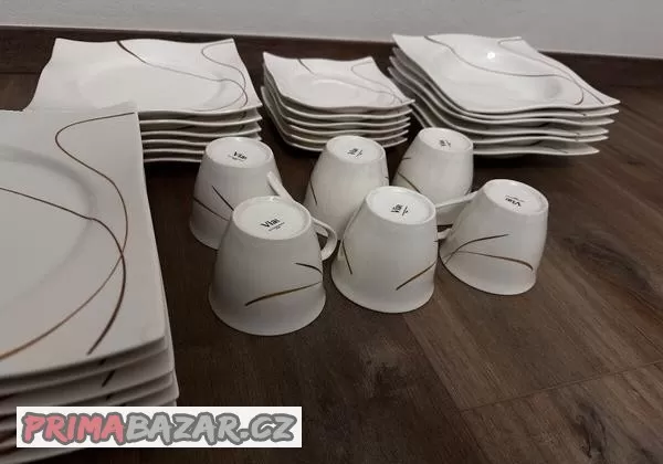Nabízím k prodeji hranatou sadu talířů s decentním vzorem zakřivených čar.