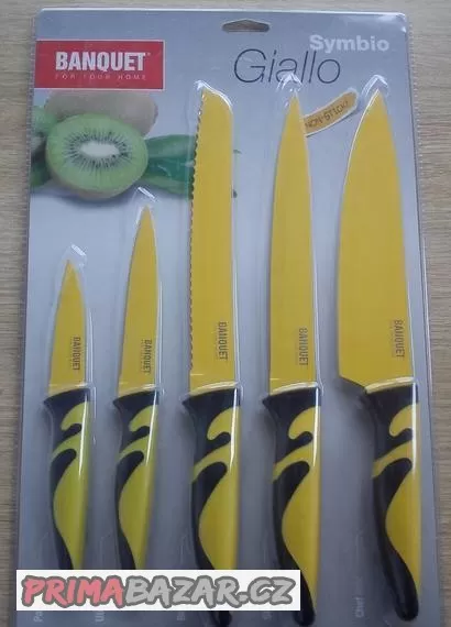 Prodám novou BANQUET 5 dílnou sadu nožů s nepřilnavým povrchem, Symbio Giallo 5 dílná sada nožů s nepřilnavým povrchem, Symbio Giallo. Kuchařský nůž 19,5 cm / 8'', Nůž na chleba 19,5 cm / 8'', Porcovací nůž 19,5 cm / 8'', Univerzální nůž 11,5 cm / 5'', Praktický nůž 8 cm / 3,5''.