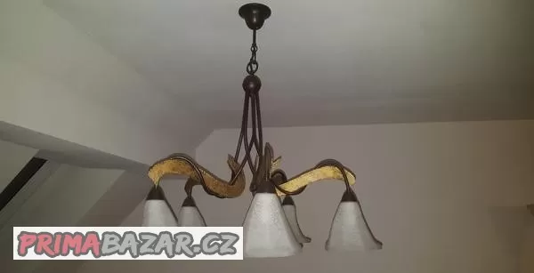 Závěsný lustr: 5-ti ramenný, žárovka patice E14. Minimální výška od stropu 78cm, lze ještě prodloužit původním řetězem o délce 70cm, velikost stínítek 15 cm. Jedno stínítko má na části cca 5cm vlasovou prasklinu.