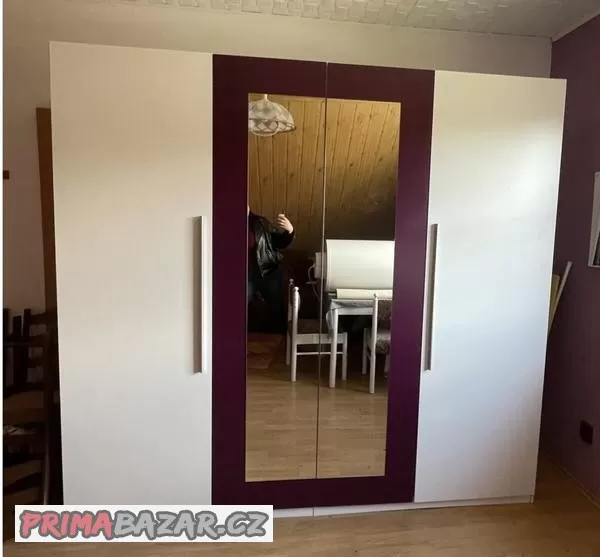 Prodám šatní skřín v krásném stavu. Skříň má 4 dveře, jedna půlka je policová, druhá je police s věšákem. Je velmi hezká, o žádné vadě nevím.