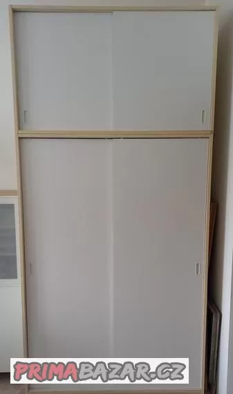 Prodám šatní skříň s posuvnými dveřmi s nástavcem. Šatní skříň je rozdělena na dvě části, ve které jsou šatní tyče. Dále jsou k dispozici čtyři police, které lze do skříně libovolně navíc umístit. Nástavec je vybaven jednou policí. Rozměry celé skříně vč. nástavce - výška 247 cm, šíře 118 cm, hloubka 61 cm. Výška nástavce 70 cm. Barva skříně je béžová se světlým vzorem. Dveře jsou bílé barvy. Skříň je mírně opotřebovaná.