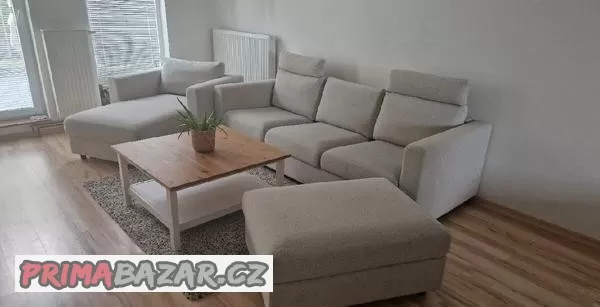 Prodám sedací soupravu Ikea - Vimle v barvě Gunnared béžová. Sedací souprava se skládá z 3místného gauče, lenošky s úložným prostorem, taburetem rovněž s úložným prostorem a dvěma záhlavníky. Sedací souprava se dá složit podle Vás = můžete si z ní udělat rohový gauč jak na pravou či levou stranu připojením lenošky. Můžete jí rozestavit do tvaru U připojením taburetu. Vše záleží na Vás a Vaší fantazii a hlavně prostoru. Montážní materiál je součástí. Sedací souprava je v krásném nezničeném stavu a není prosezená. Má snímatelné všechny potahy, takže před prodejem bude kompletně vyčištěna.