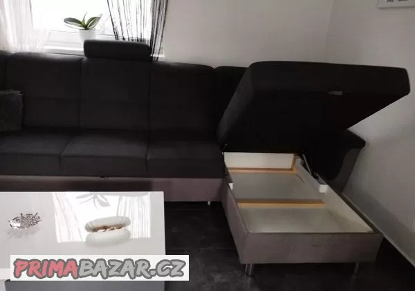 Prodám krásnou,čalouněnou, rozkládací sedací soupravu s úložným prostorem. d.380cm,š.delší strany 160cm, kratší str.94cm,v.90cm.
