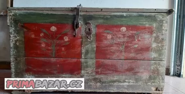 Nabízím starožitnou malovanou truhlu s kováním v horším stavu k restaurování š 113 x v 62 x h 62.