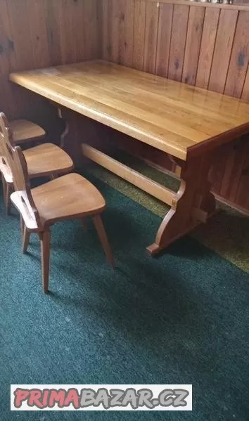 Prodám selský jídelní stůl rozměr 160cm x80cm,5ks židlí,a jednu lavici,starší ruční výroba na zakázku,cena za celý komlet