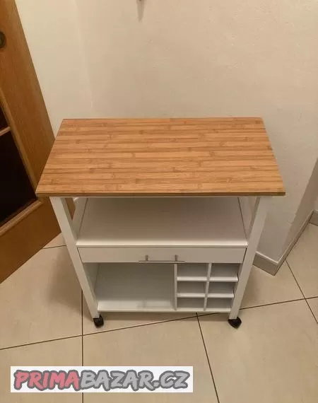 Prodám servírovací stolek o rozměru 350x650x790 mm (ŠxDxV) na kolečkách. Součástí stolku je organizér o 6 poličkách a integrovaný šuplík. Stav jako nový, používán pouze k odkládání věcí.