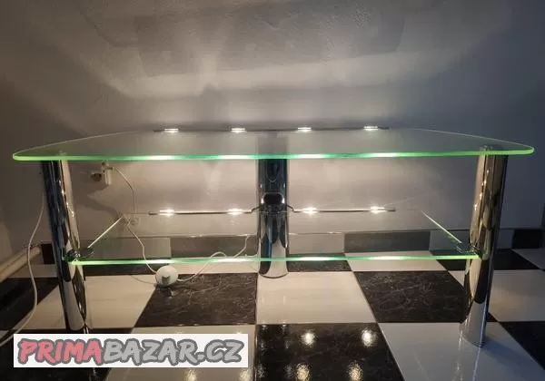 Skleněný stůl pod televizi s osvětlením a chromovými komponenty.