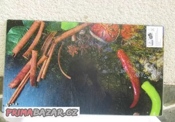 Sklokeramická deska má dekor zelenina a koření, je nová, nepoužitá v originální krabici, velikost cca 52x30cm.