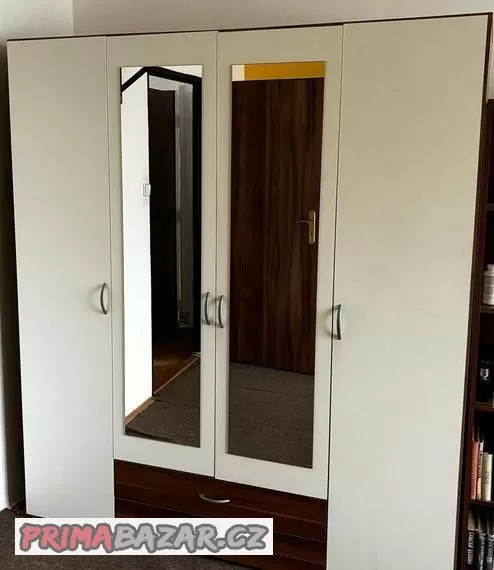 Prodám čtyřdveřovou skříň, lamino, bílá a ořech. Zrcadla na 2 dveřích, kombinace šatní části i police, 2 zásuvky. Rozměry šířka 173 cm, hloubka 53 cm, výška 194 cm. Cena 3 900 Kč. Možno koupit včetně komody,s bílým psacím stolem - viz další inzeráty, v tom případě sleva.