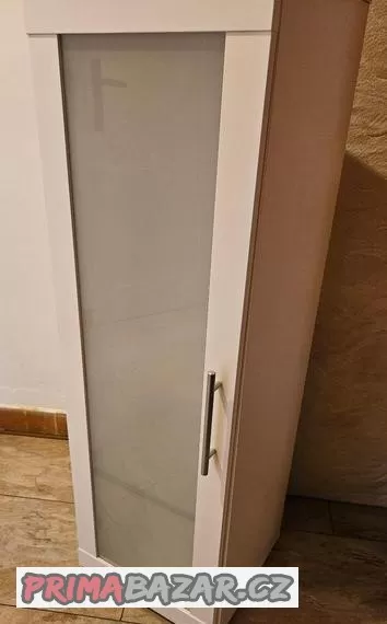 Bílá lesklá skříň s matnými prosklenými dveřmi a sklěněnými poličkami. Vypadá jako nová