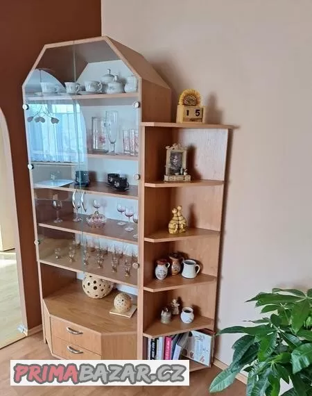 Skříň s prosklenými dvířky, dekor olše, s boční poličkou. Jako nová. Chlumec nad Cidlinou. K odběru ihned.