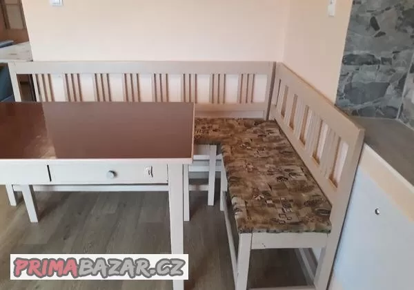 Krásná rohová lavice z masivu s čalouněním. Čalounění vyčištěné. Pozůstalost z chalupy, bohužel se nám nevejde do kuchyně - moc velké.