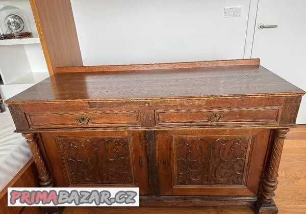Nabízím krásnou zachovalou dřevěnou komodu, rozměry 155x91x61 cm. Komora má 2 šuplíky (v jednom vyměněné dno), výsuvnou desku na psaní a velký úložný prostor uvnitř. Vše plně funkční. Místy drobné nedokonalosti - viz. foto. Cena dohodou.