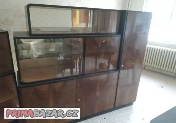 prodám retro prosklenou skříň / kredenc s barem z tmavého ořechu, kompletní nepoškozená se všemi skly.