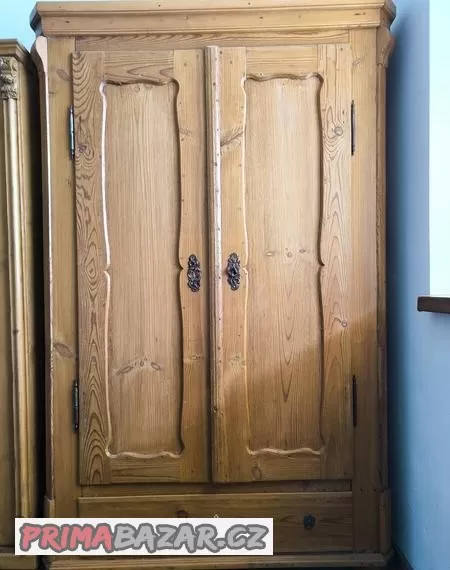 Starožitná skříň z 19. století. Uvnitř jsou momentálně police přes celou šířku, ale nachází se v ni i dva věšáky. Stačí police vyndat. Dole je zamykací šuplík. Skříň prošla louhováním i renovací. Při rychlém jednání možná sleva.
