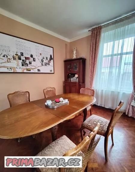 Prodám jídelní set dřevěný starožitný stůl a 6 židlí. Stůl je rozkládací, kvalitní zpracování sedáků, krásné řezby, masiv. Rozměry: délka 128 cm (rozložený 202 cm), šířka 100 cm, výška 76 cm. Poškozené výplety židlí (viz. foto), proto tak nízká cena.