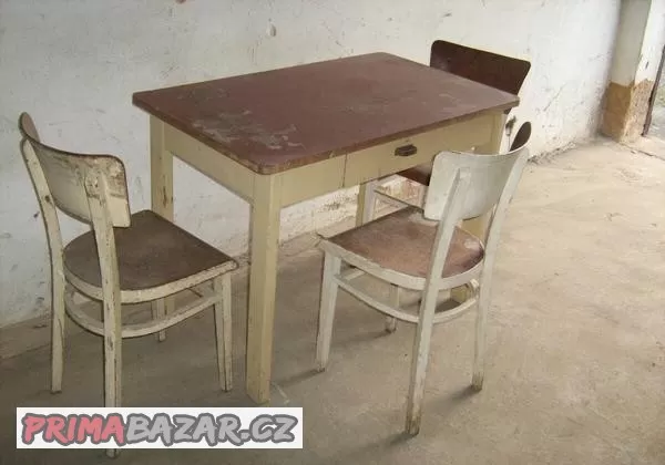 Retro stůl + 3 židle viz foto. Tel.702352732 u Konst. Lázní.