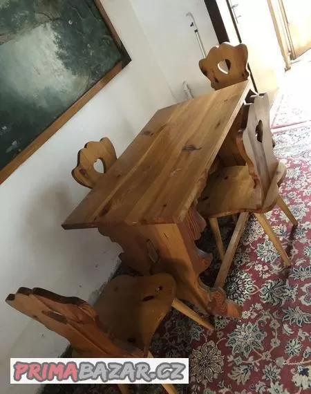 Souprava stolu a židlí dle foto. Stav viz real foto. Vada co není na foto je uvolněná noha u jedné židle, což stačí zalepit. Jinak velmi zachovalý stav, v podstatě léta stálo bez využití, jen k odkládání věci na stůl.