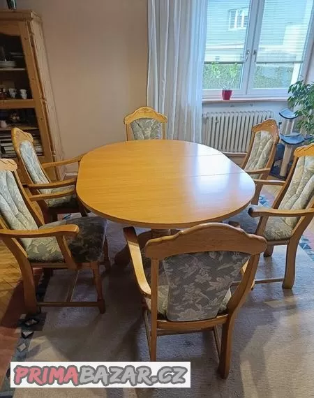 Stůl a 6 židlí, masivní světlé tvrdé dřevo. Deska stolu dýha, noha masiv.Ke stolu prodáváme i další kusy nábytku, lustry, koberce, viz moje další inzeráty.