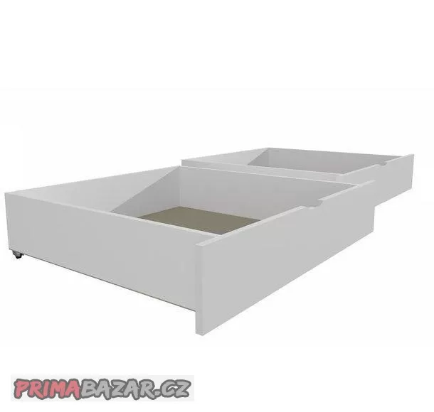 Prodám zcela nové, nepoužité šuplíky pod postel v bílé barvě. Zboží je originál zabalené a bylo součástí postele, bohužel nevyužijeme. Šuplíky jsou vyrobeny z lamino desek a mají kolečka pro snadnou manipulaci. Výška čela šuplíku 23 cm, výška šuplíku samotného je cca 17 cm. Šířka jednoho šuplíku 97 cm. Určeno pod postel 200x90 cm. Foto ilustrační, jedná se o stejné šuplíky u fotografie postele.