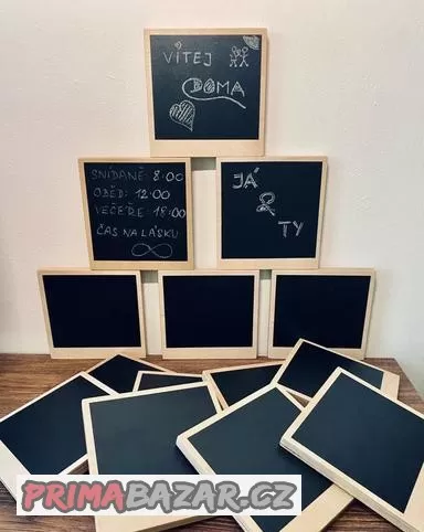 Dřevěná tabulka s černou plochou na popisování křídami na styl polaroidu. Lehce omyvatelné navlhčeným hadříkem. Dřevo ošetřené lakem. Křída součástí balení.