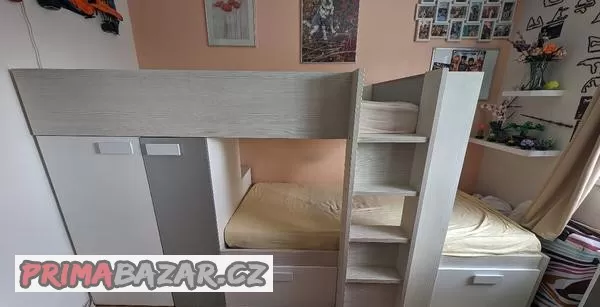 dětská palanda, plocha na spaní 200x90, prostor mezi horním a dolním lůžkem je 76cm, výška-150cm, hloubka-110cm, délka-293cm, nosnost 90kg každá, doba používání cca 4 roky, v dobrém stavu, rozmontována
