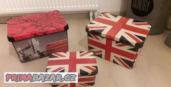 prodám úložné boxy z plastu s motivem Anglie.1ks o šířce18cm,délce28cm a výšce 13cm,2ks o šířce 28cm,délce38cm a výšce 23cm.