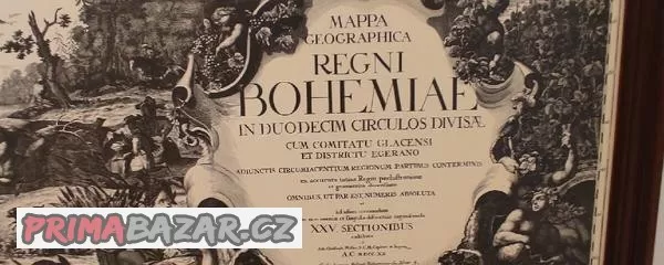 Grafika, replika mapy z roku 1720, mapa je vytištěna na desku, vše v decentním dřevěném rámu o rozměru 176x145 cm.