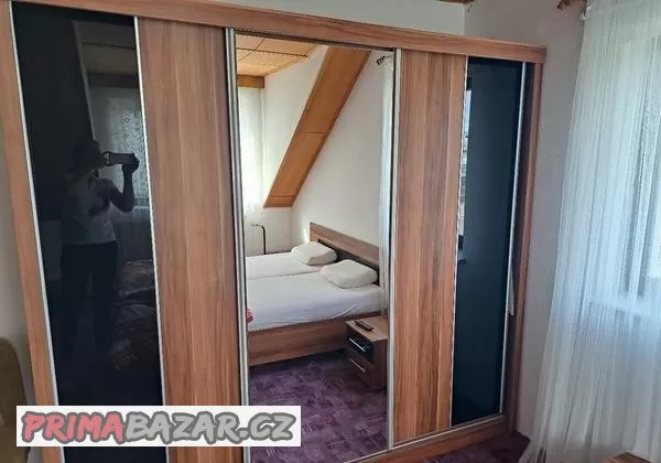 Prodám velkou šatní skříň, žádné vady. Posuvné dveře. V 210cm, Š 230cm. Uprostřed za zrcadlem je policová část a na krajích je závěsný systém na šaty a police. Pro více informací pište popřípadě ještě nafotím.