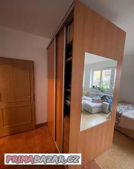 Velká šatní skříň z masivu. Šířka 153 cm x výška 250 cm x hloubka 118 cm. Posuvné dveře 2x76 cm. Na straně skříně velké zrcadlo 80x120 cm. První část jsou poličky a zásuvky na oblečení. Zásuvky s dojezdy. V druhé části jsou dva věšáky na šaty a kabáty. Ke skříni je přistavěná samostaná polička šířka 30 cm x hloubka 45 cm x výška 250 cm.