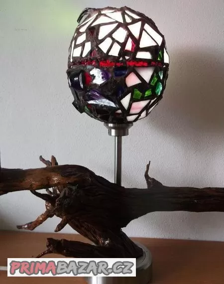 Lampa vyrobena technikou Tiffany z opalového skla, skla spectrum, skla UROBOROS, skleněných kabošonů ze sklárny Bělá pod Bezdězem. Samorost, respektive kořen borovice, od Máchova jezera. Lampová noha je vybroušena z nerezu. Uvnitř žárovka LED 35 W. Je možno vložit i silnější LED žárovku. Kabel bílý, patina bronz a měď.