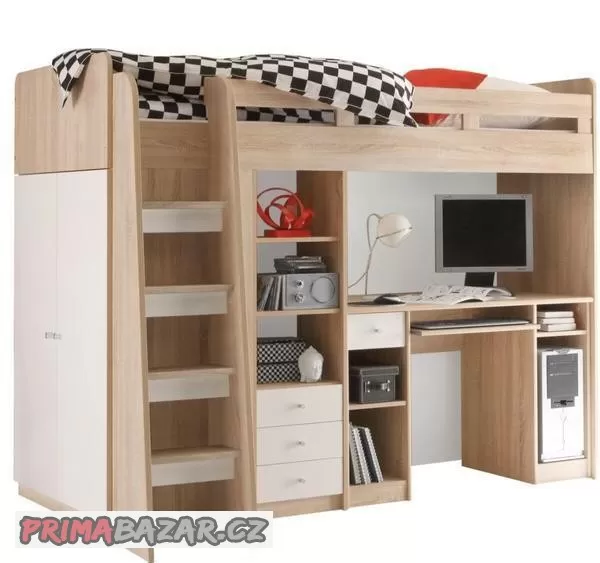 Součástí postele žebřík,zábrana k lůžku, boční vestavěná skříň ,další úložný prostor je v policích a zásuvkách. Psací stůl je možné postavit volně mimo postel.