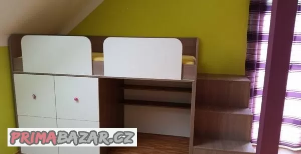 Prodám na zakázku dělanou vyvýšenou postel, kvalitní zpracování, spousta úložného prostoru. 4 velké šuplíky pod ložní plochou, dalších 6 šuplíků ve schodech. Včetně roštu a matrace.
