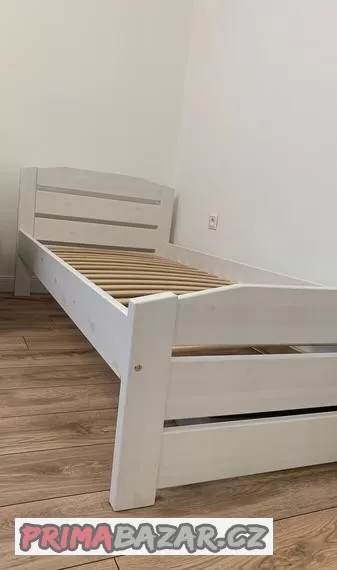 Prodávám postel, jednolůžko, stare 2 roky. nemá využití. Včetně roštu. Masiv borovice asi.)