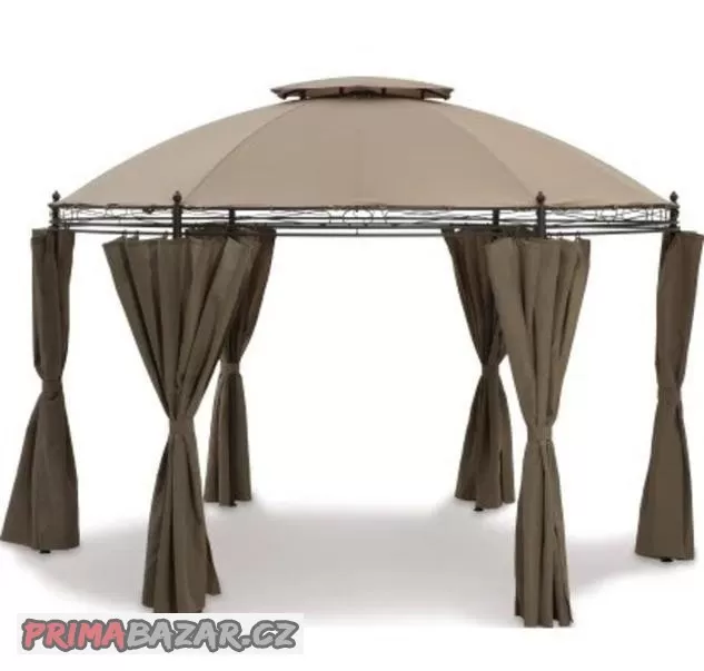 Altán má nadstandardně pevnou konstrukci, je vybaven látkovými bočními stěnami.