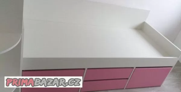 Na zakázku vyrobená dívčí postel s úložným prostorem, je zcela jako nová. Rozměry 205 x 94 x 85 cm, výška k matraci je 55cm. Postel je možno koupit i s matrací. Postel je velmi hezky a precizně zpracovaná. Pro převoz bude rozebraná. Cena je včetně matrace. V současnosti je již rozmontována a připravena na odvoz.