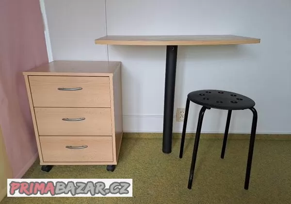 Prodám zásuvkový kontejner na kolečkách v dekoru světlého dřeva. Rozměry 42,5 * 40 * 56 (šířka * hloubka * výška). Možné nabídnout i včetně stolku s rozměry 77 * 43,5 * 71. Nábytkovou nohu pod stolkem je možné výškově nastavit. Stolek včetně kotevního prvku do stěny. Cena při odběru stolku i kontejneru 500. Kontejner samostatně 300, stolek samostatně 300.