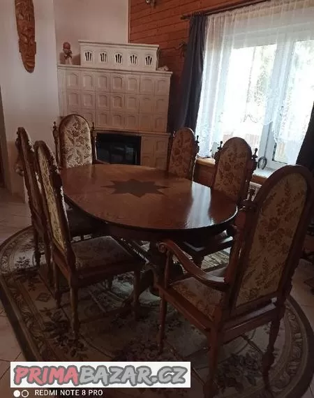 Prodám jídelní stůl s vykládánou deskou, rozkládací, 2 křesílka s područkami a 4 židle. U jedné židle nutná malá oprava.