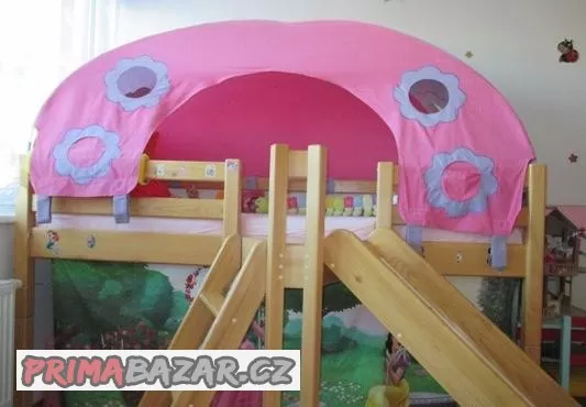 Prodám celý komplet zvýšené postele Domestav (postel bez matrace, skluzavka, schůdky,stan, závěsy - Disney)