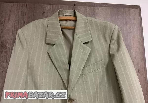 Světlý 3-dílný pánský oblek, zhruba na velikost M-L a výšku 191 cm.